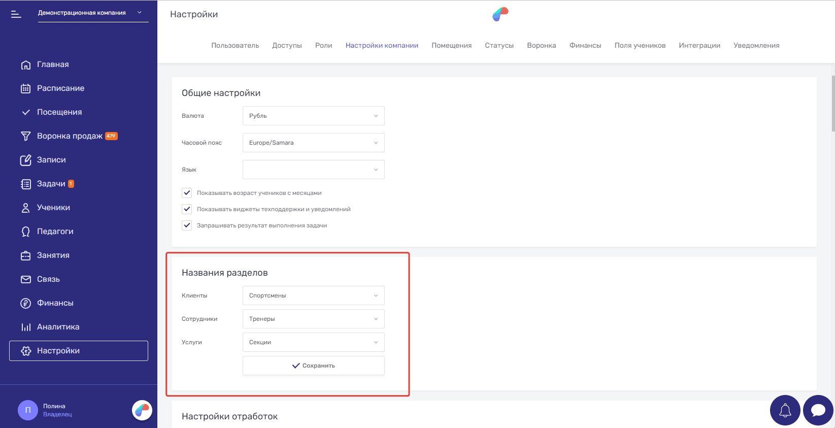 По умолчанию в Параплан выбраны наименования Клиенты, Сотрудники и Услуги. Их можно поменять в разделе “Настройки” во вкладке “Настройки компании”. После обновления веб-страницы настройки названий будут применены.