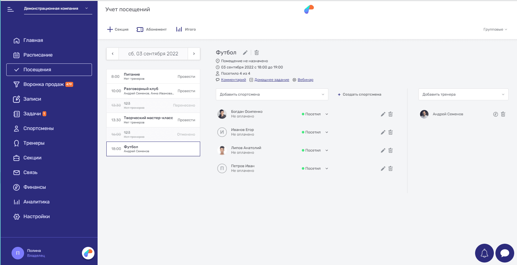 Раздел “Посещения” с выбранными названиями “Спортсмены”, “Тренеры”, “Секции”