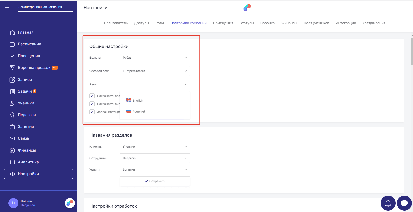 Если нужно, чтобы конкретный язык был применен ко всем филиалам и пользователям, зайдите в раздел в левом меню “Настройки”, далее вкладка “Настройки компании”, ниже в блоке “Общие настройки” выберите нужный язык и нажмите кнопку “Сохранить”. После этого система попросит вас перезайти в аккаунт. Затем новые настройки языка вступят в силу.