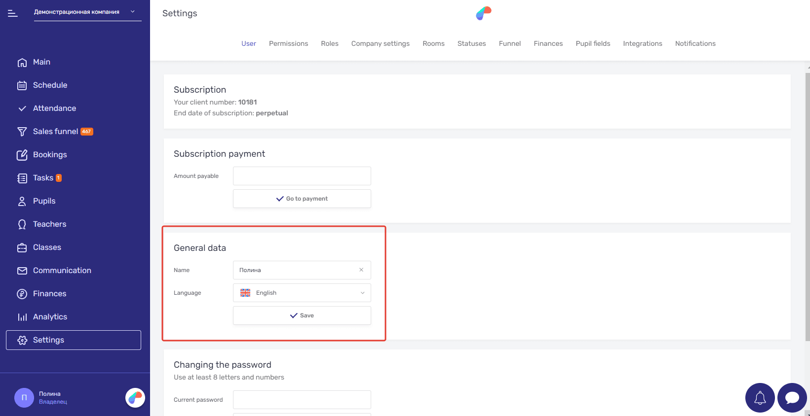 Для этого пользователю нужно зайти в раздел в левом меню “Настройки”, далее вкладка “Пользователь”, ниже в блоке “Общие данные” выбрать нужный язык и нажать кнопку “Сохранить”. Настройки вступят в силу после следующего захода в систему.