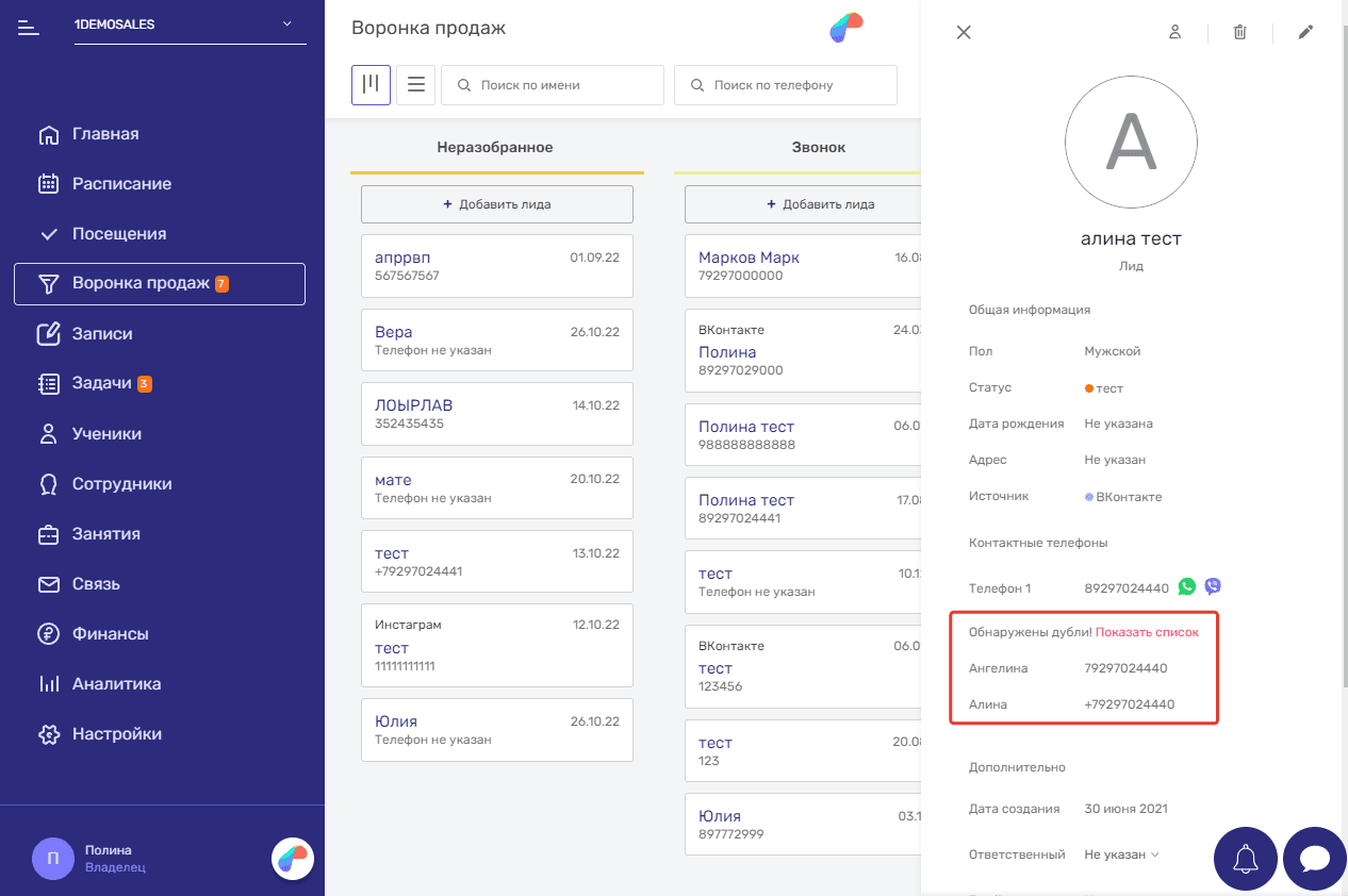 При создании лида в “Воронке продаж” система покажет все возможные совпадения с введенным номером телефона. В список дублей попадут и лиды, и клиенты.