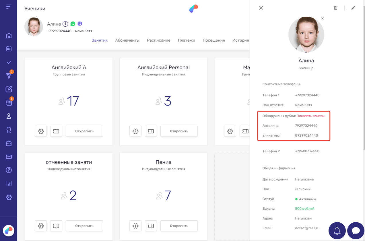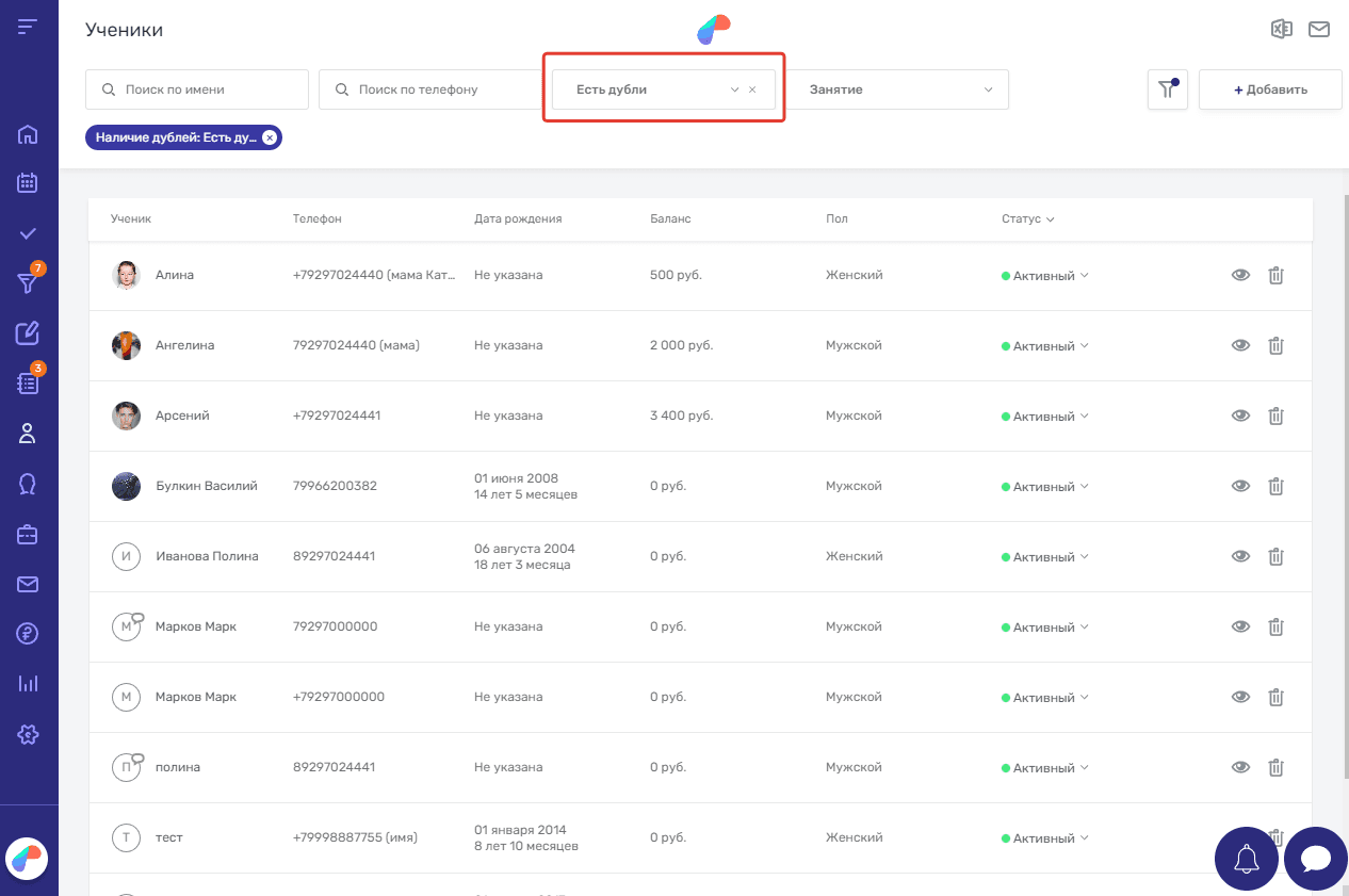 Фильтр “Наличие дублей” в разделе “Клиенты/Ученики”