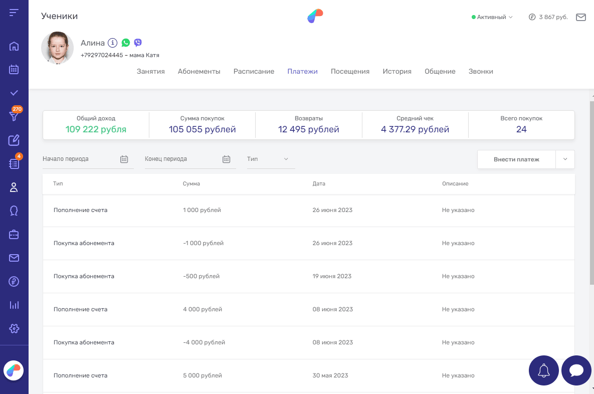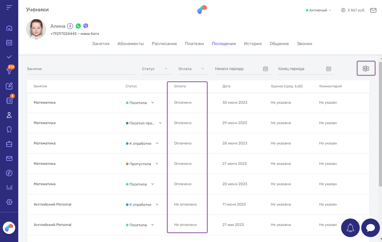 Статус оплаты посещений в профиле ученика в Параплан CRM