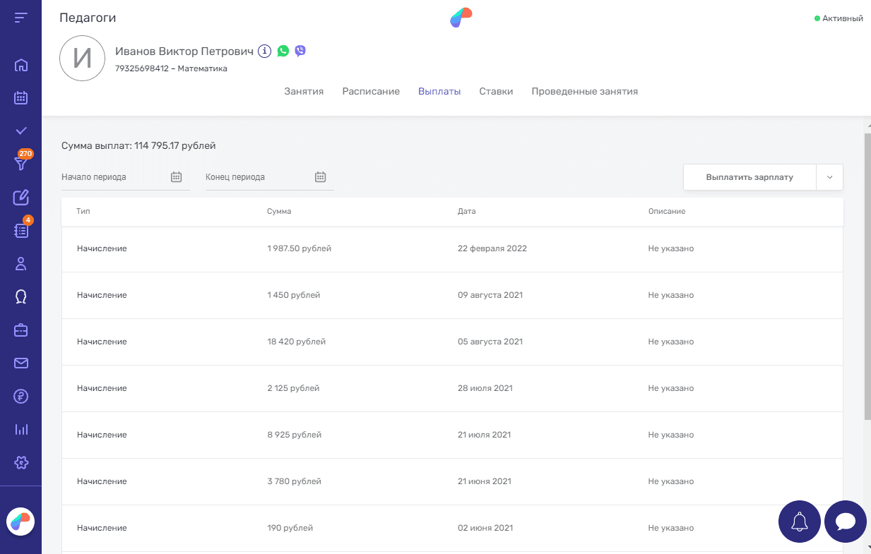Во вкладке “Выплаты” в профиле сотрудника/педагога добавлена строка с информацией о сумме выплат. Вы можете выбрать конкретный период, чтобы узнать, какова была общая сумма выплат сотруднику.