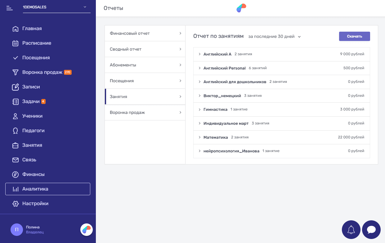 Показатели доходности занятий в разделе “Аналитика” в Параплан CRM