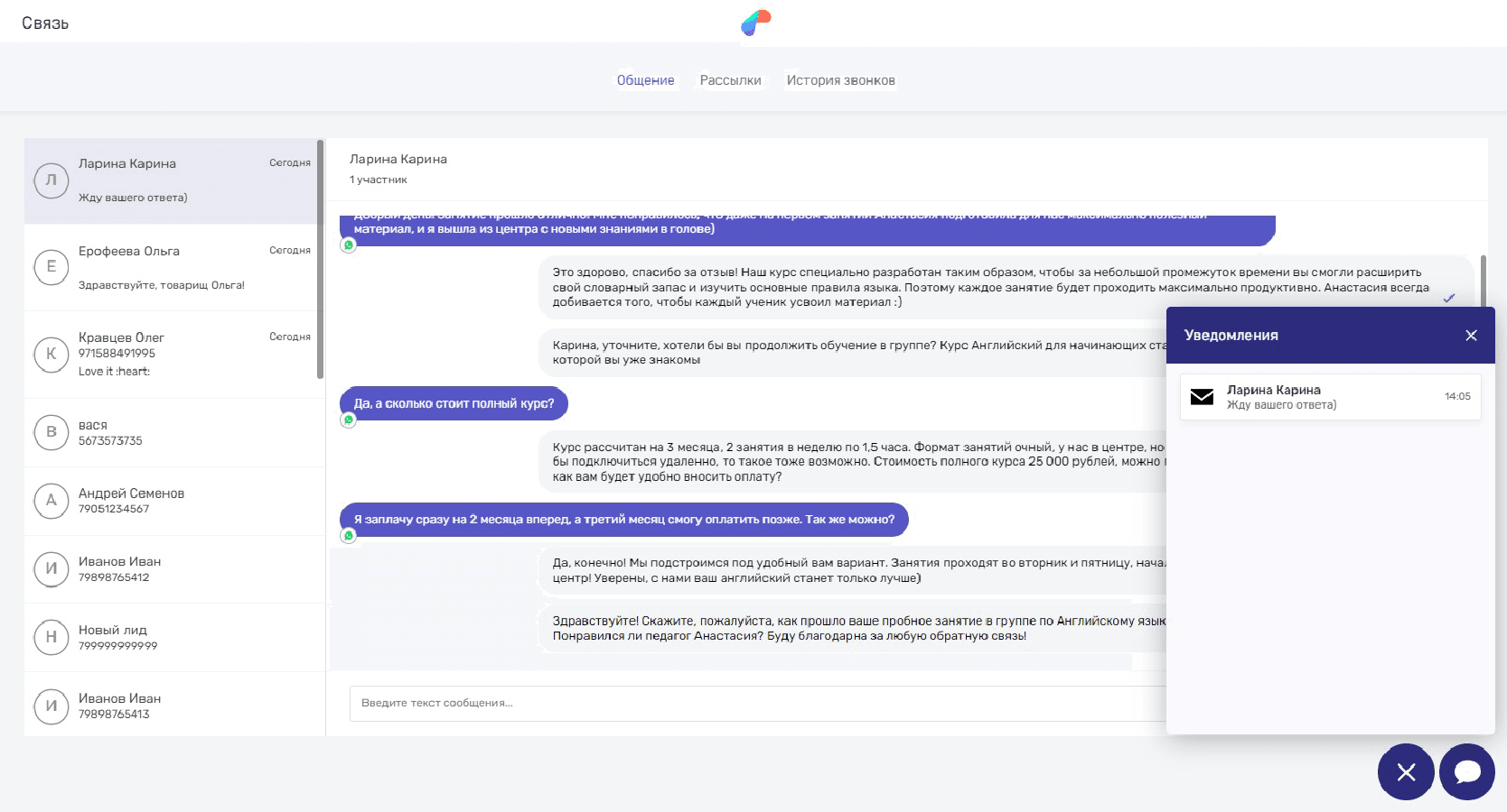 - Все переписки с клиентами ведутся из единого окна CRM-системы в разделе “Связь”.