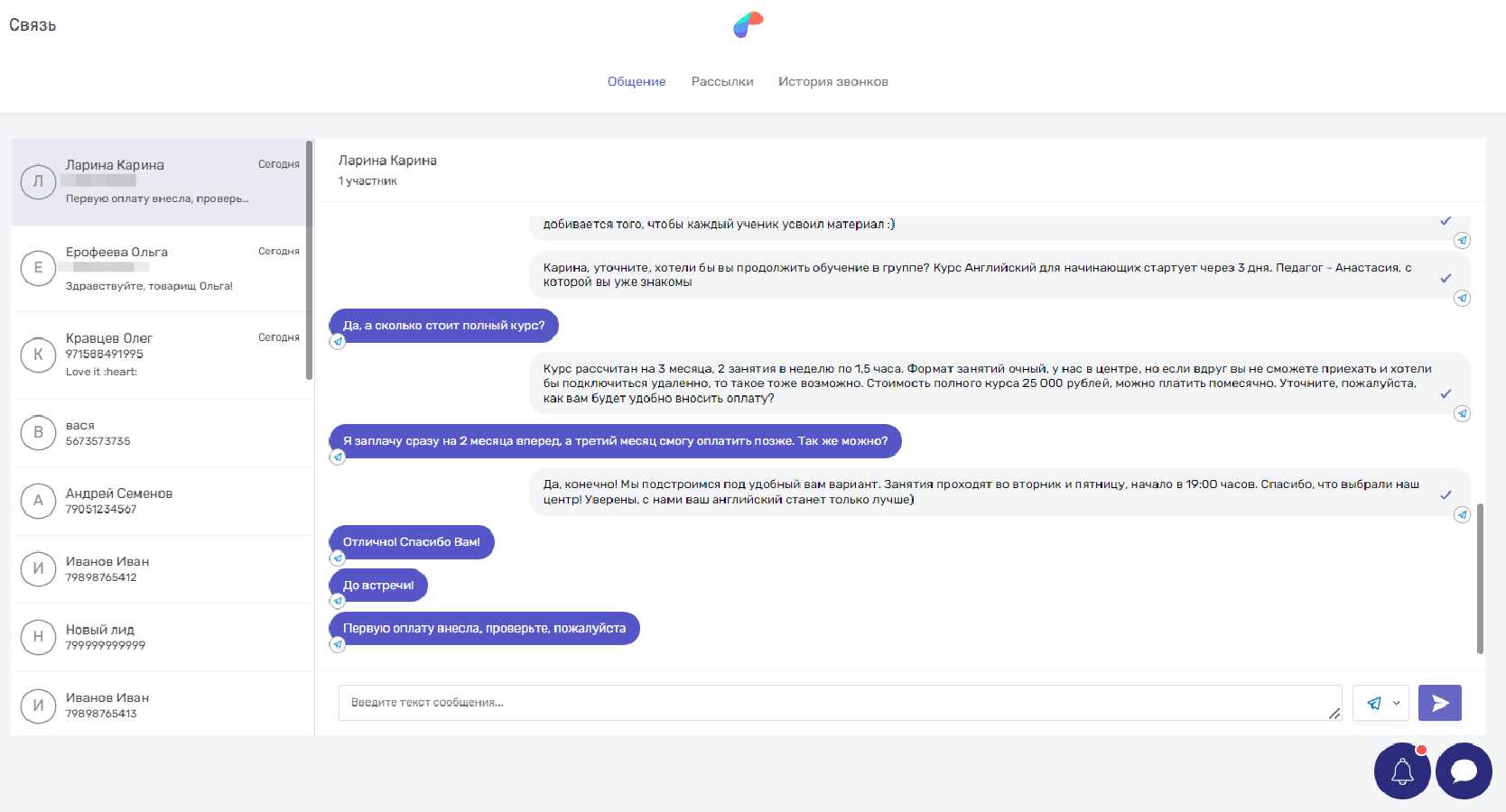 - Все сотрудники центра общаются с учеником или лидом с одного номера.