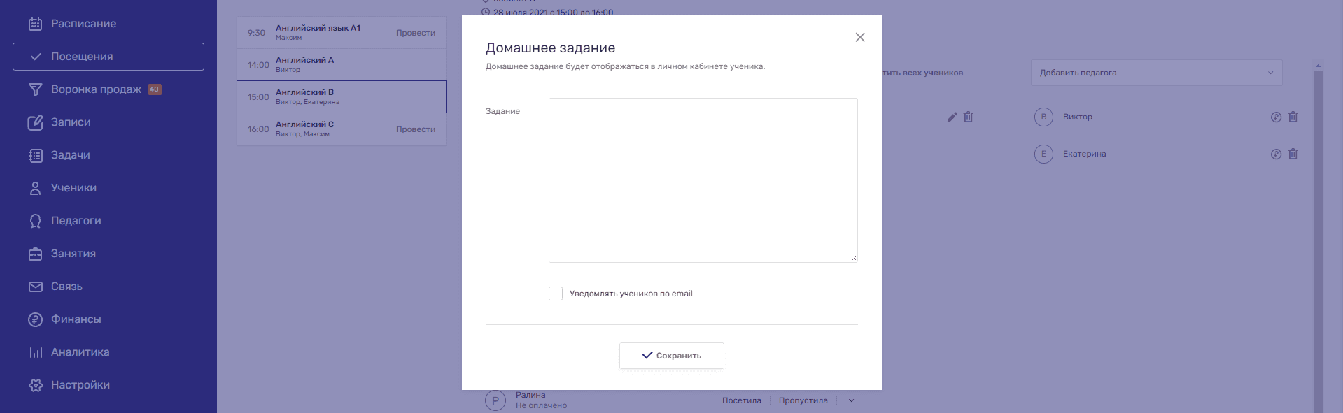 - Указать домашнее задание и решить, уведомлять ли учеников по email