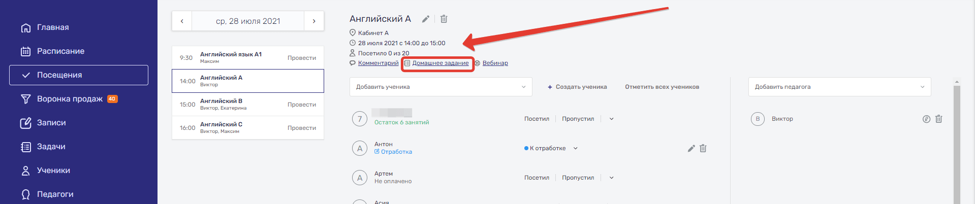 Важно знать: добавить домашнее задание можно только после того, как у занятия будет хотя бы одна отметка посещения.