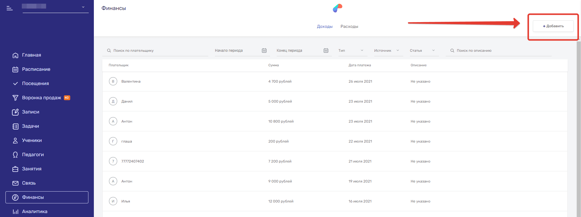 В раздел Финансы будут попадать все ваши финансовые операции, произведенные внутри Параплан CRM, а также поступления через интернет-эквайринг.