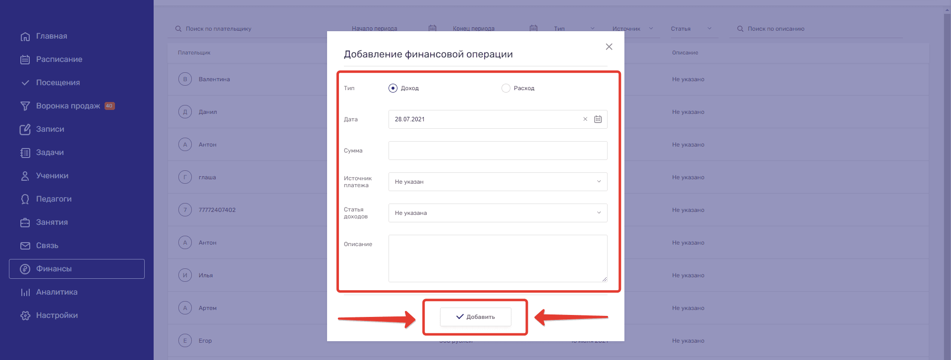 Добавить доход и расход можно напрямую в разделе Финансы. Для этого вам нужно: