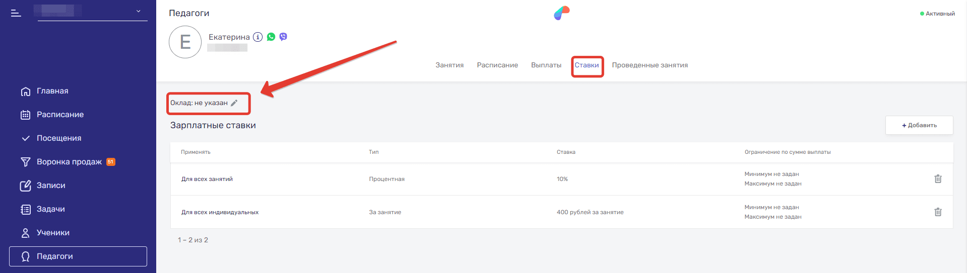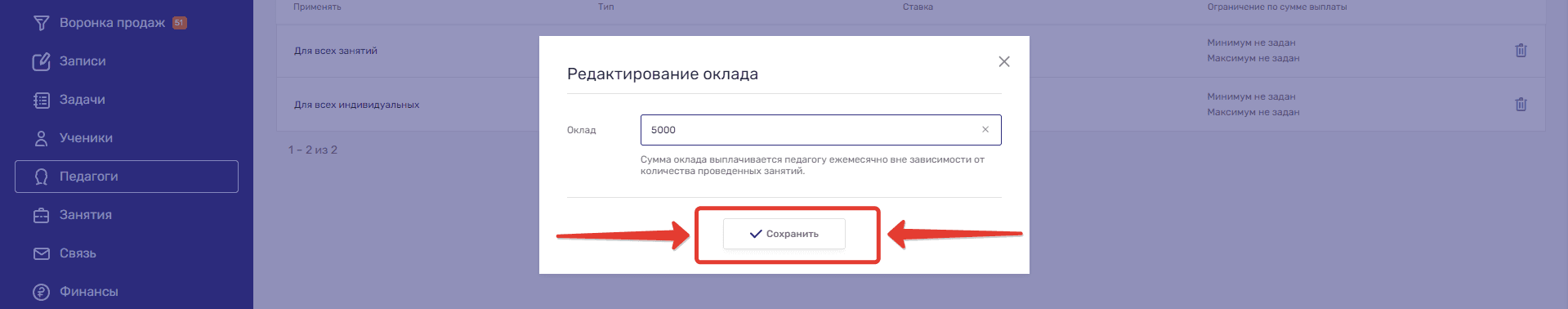 Чтобы добавить педагогу оклад, который можно будет выплачивать независимо от проведенных занятий, вам нужно: