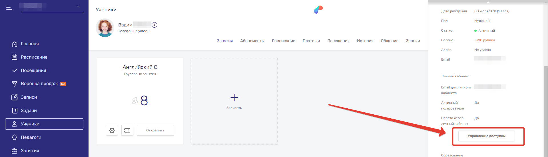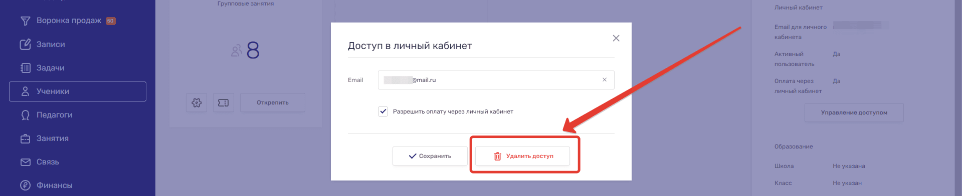 Чтобы закрыть конкретному ученику доступ к Личному кабинету, необходимо: