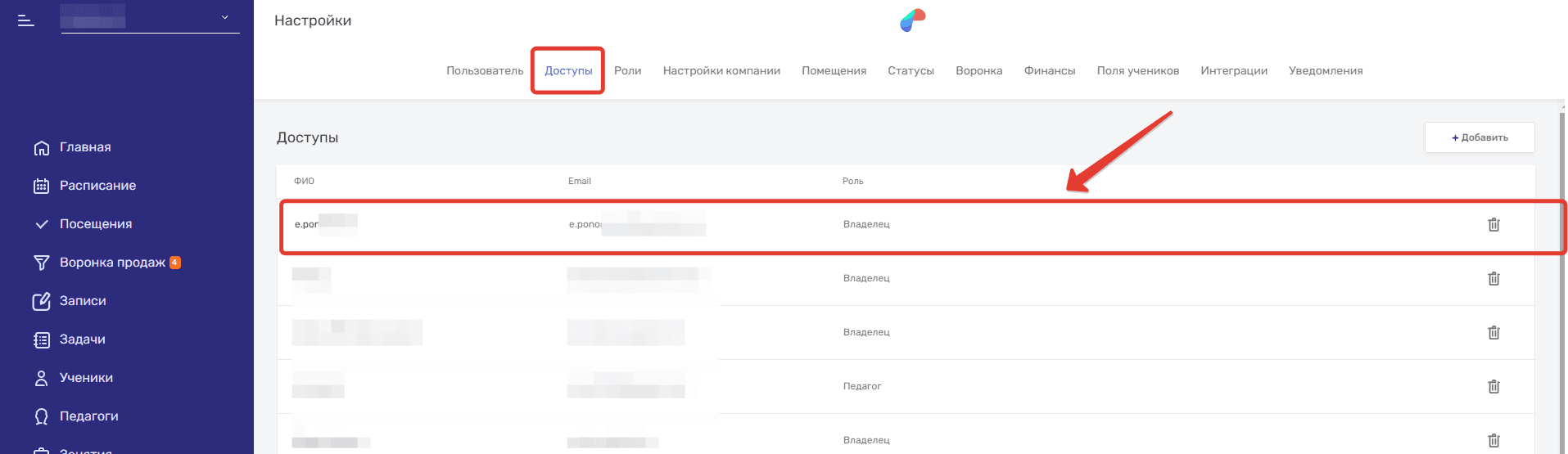 - Кликнуть на вкладку Доступы
