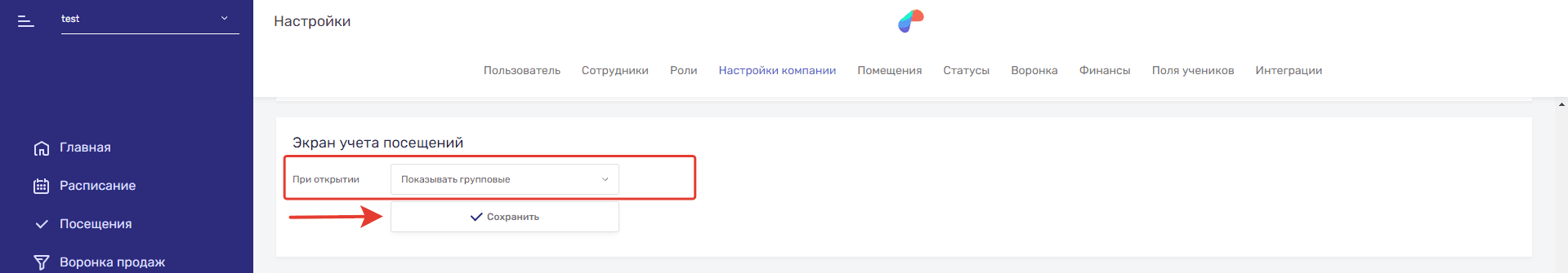 По умолчанию в системе выбраны Групповые, они в разделе Посещения отображаются сразу после перехода в него. Если у вас больше проходит индивидуальных занятий, для удобства лучше переключить на них, чтобы меньше переключаться между их типами для отметки учеников.