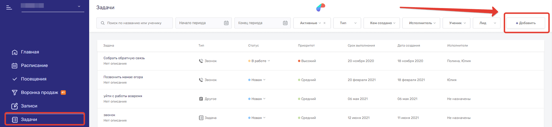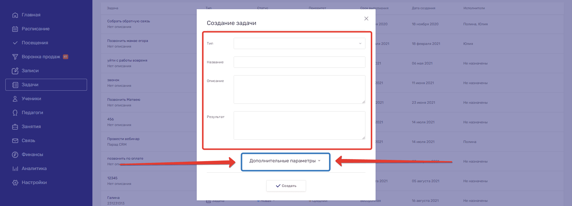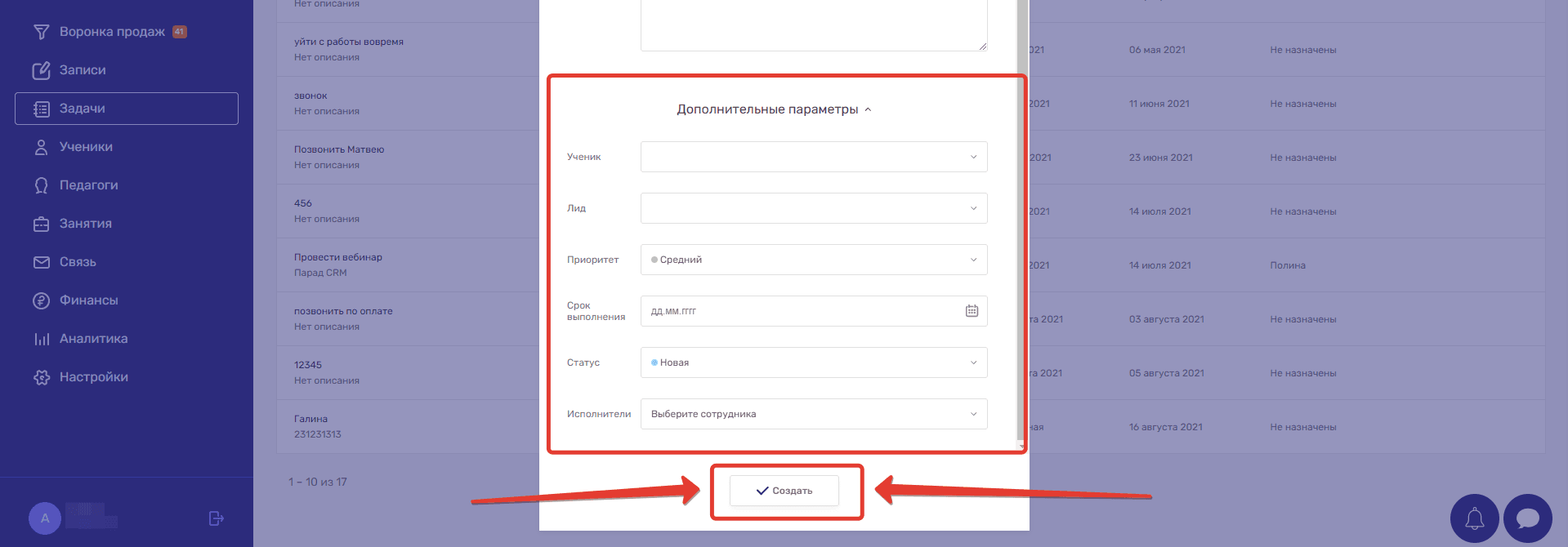 - По желанию выберите ученика или лида, к которому будет прикреплена задача