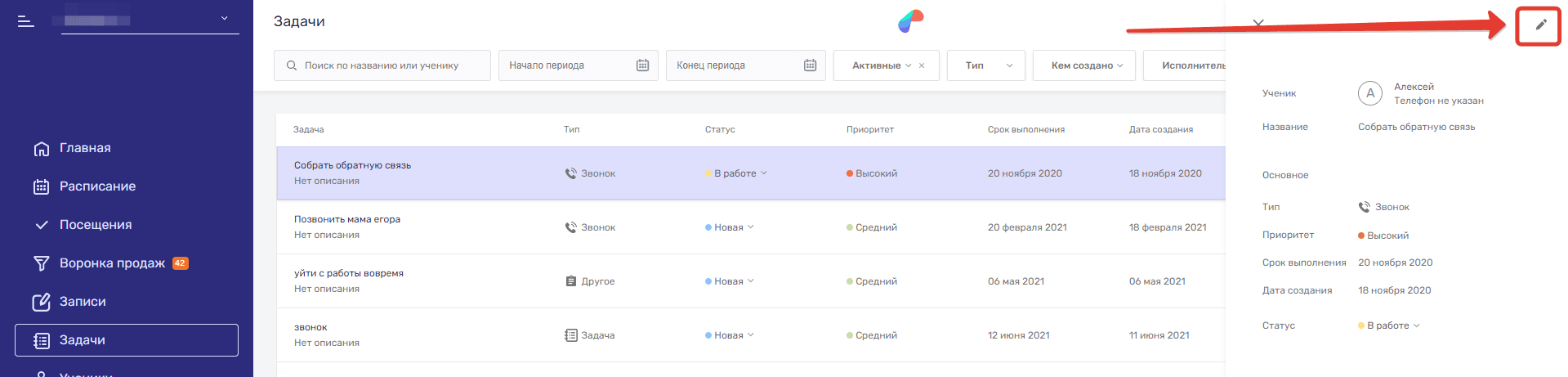 Чтобы отредактировать задачу, достаточно кликнуть по ней. Справа появится окно, где вам нужно нажать на значок карандаша.