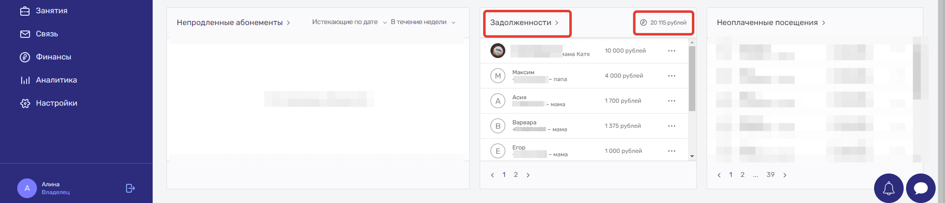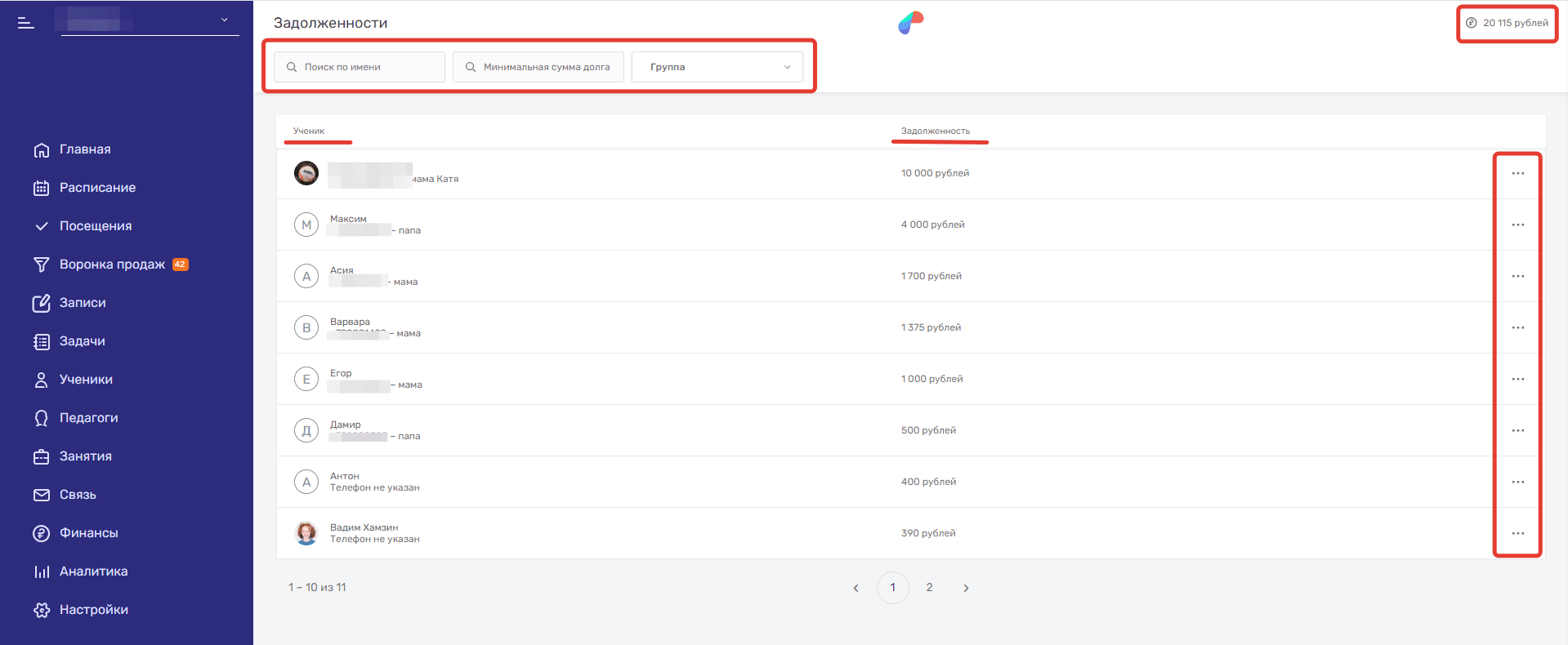 Если кликнуть на строку Задолженности, то система перенаправит вас в новое окно. Здесь списком выводятся все ученики с отрицательным балансом, а также есть возможность фильтровать их по имени, минимальной сумме долга и группе.
