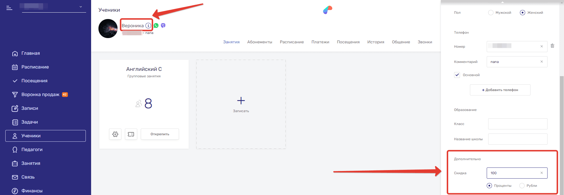 Если вы хотите предоставить конкретному ученику индивидуальную скидку, которая будет применяться ко всем абонементам, вам нужно: