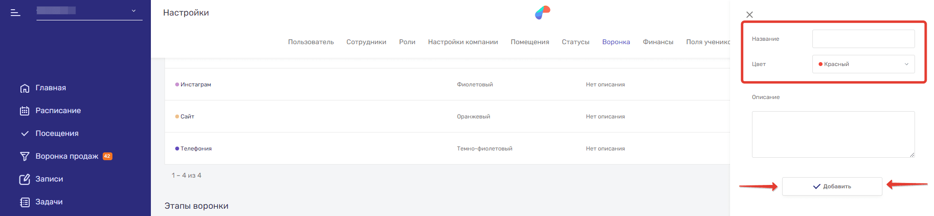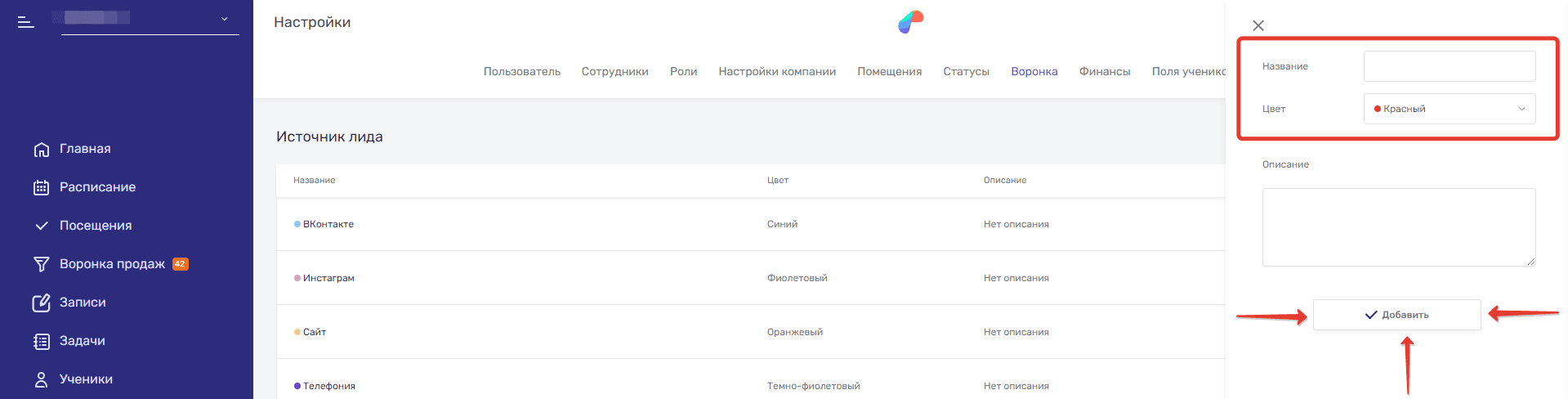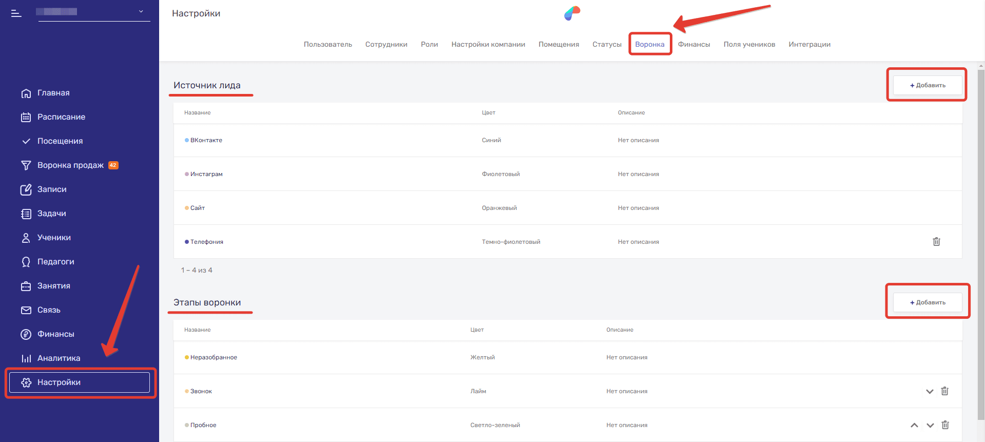 Воронка продаж — полезный инструмент для всех, кто использует каналы рекламы для привлечения клиентов в свой центр. В Параплан CRM можно настроить все необходимые этапы воронки, чтобы видеть весь путь клиента: от первого обращения до покупки. Вкладка Воронка в разделе Настройки делится на 2 блока: Источник лида и Этапы воронки.