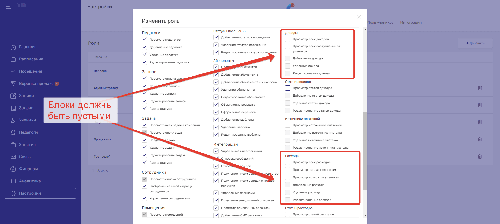 - Убрать галочки у пунктов Просмотр всех доходов и Просмотр всех доходов, блоки Доходы и Расходы не должны содержать галок