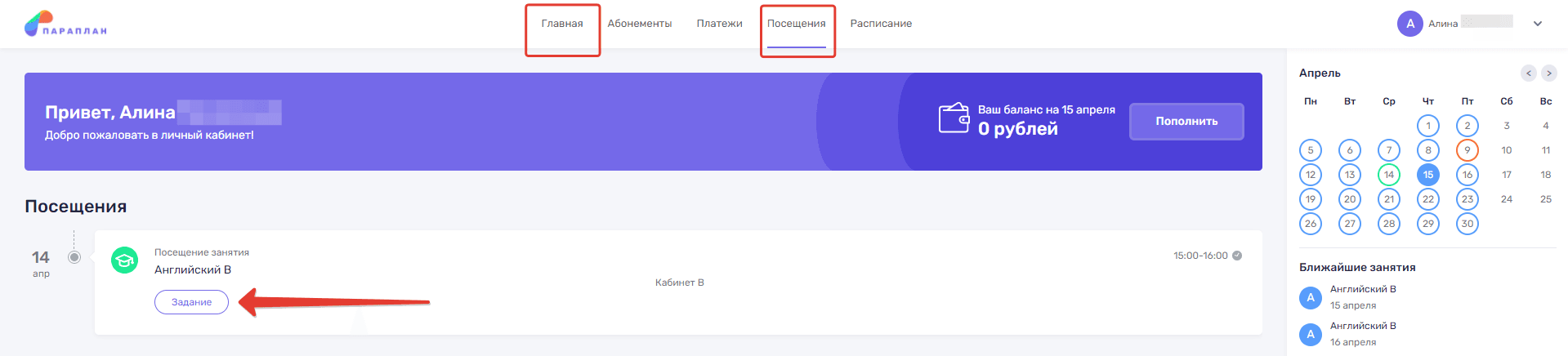- в Личном кабинете во вкладках Главная и Посещения у посещенного занятия