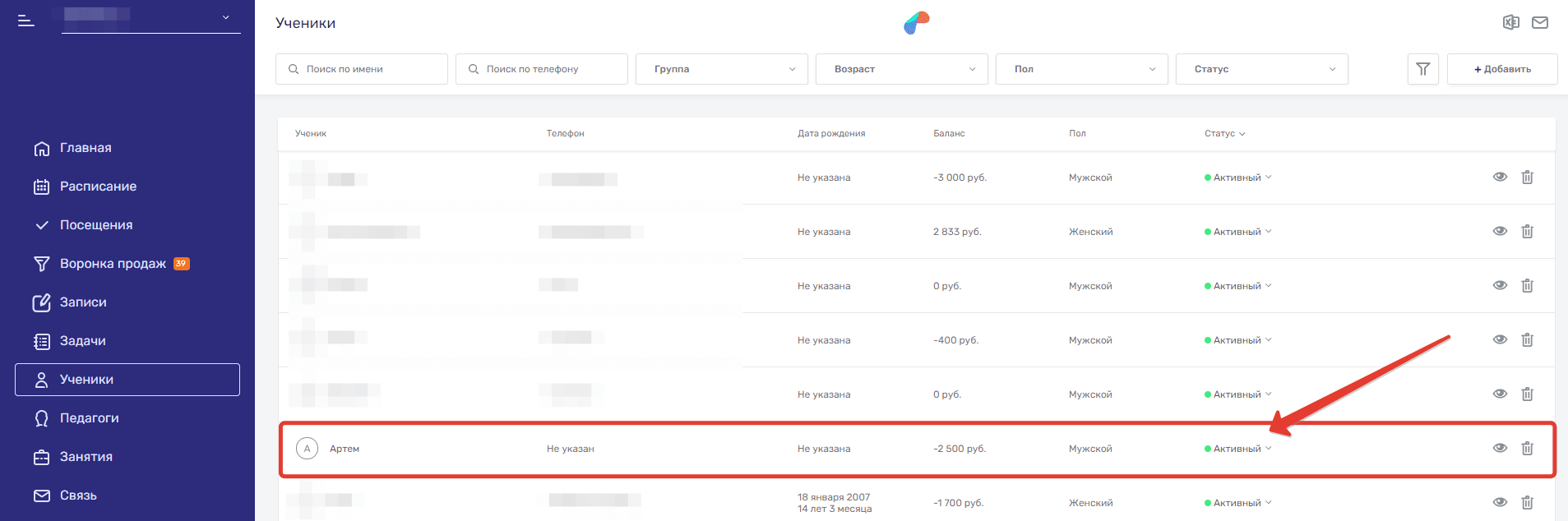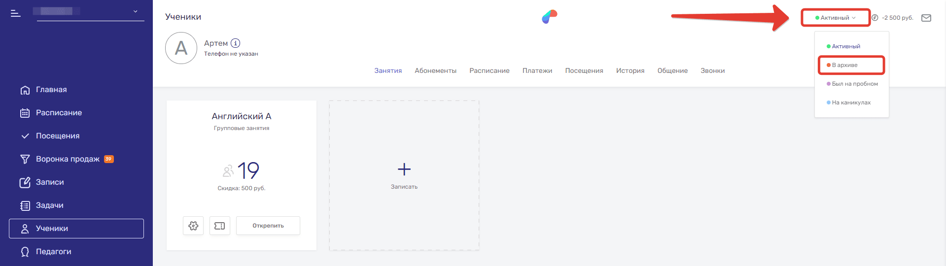 Сменить статус можно без перехода в профиль ученика в разделе Ученики, кликнув на его статус.