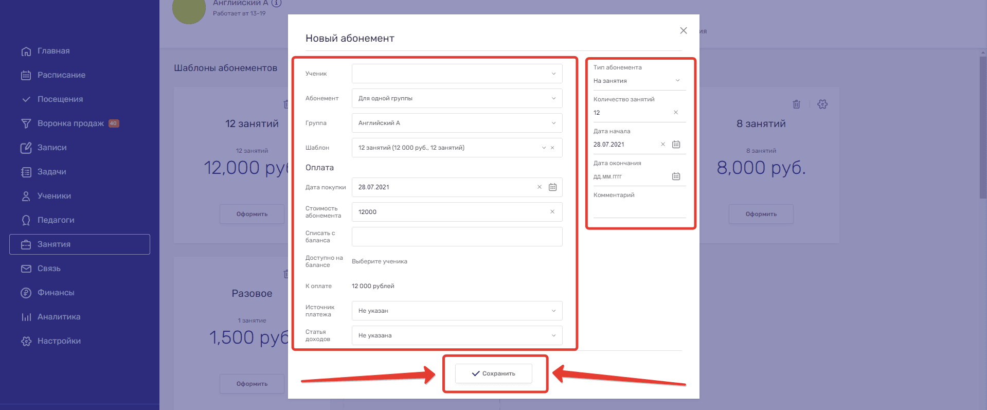 - Справа выбрать тип абонемента, указать период или количество занятий, выбрать дату начала и окончания абонемента, оставить комментарий