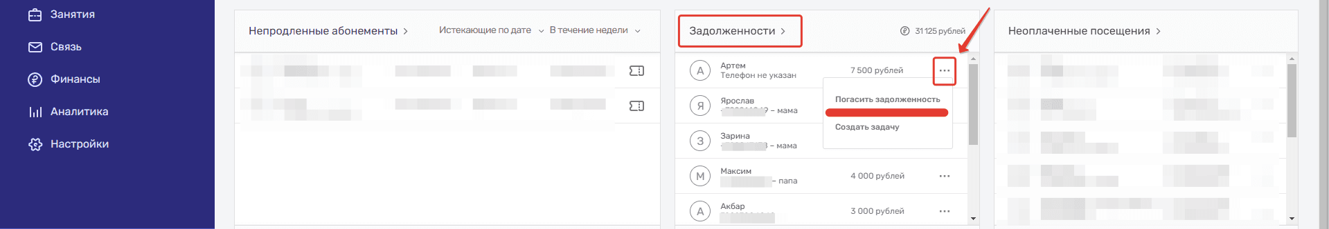 - В окне Задолженности выбрать ученика и кликнуть на 3 точки рядом с суммой долга