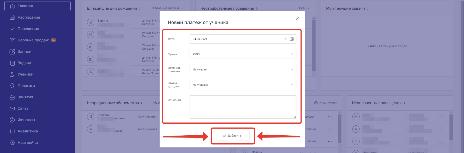 Еще один способ погасить задолженность — внести платеж, как это было показано в статье Как внести платеж на баланс ученика