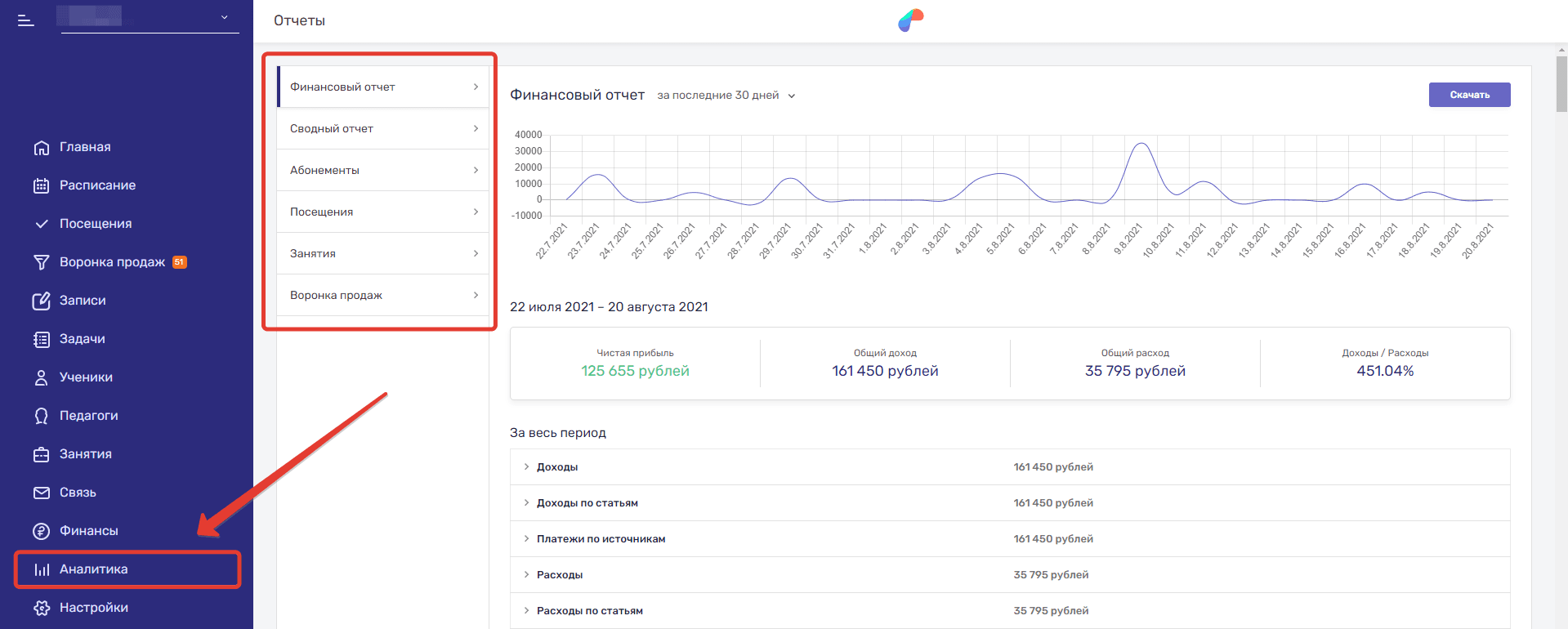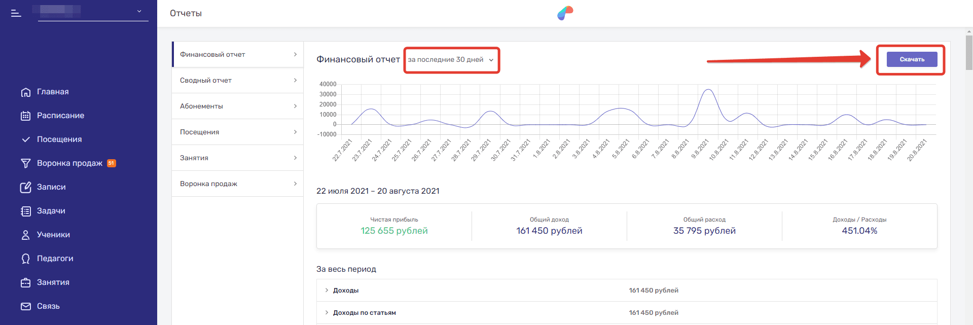 - Финансовый отчет — здесь отображаются движения средств за выбранный период: доходы, расходы, платежи по источникам, доходы по статьям, расходы по статьям. А также система посчитает соотношение доходов к расходам. Отчет можно скачать.