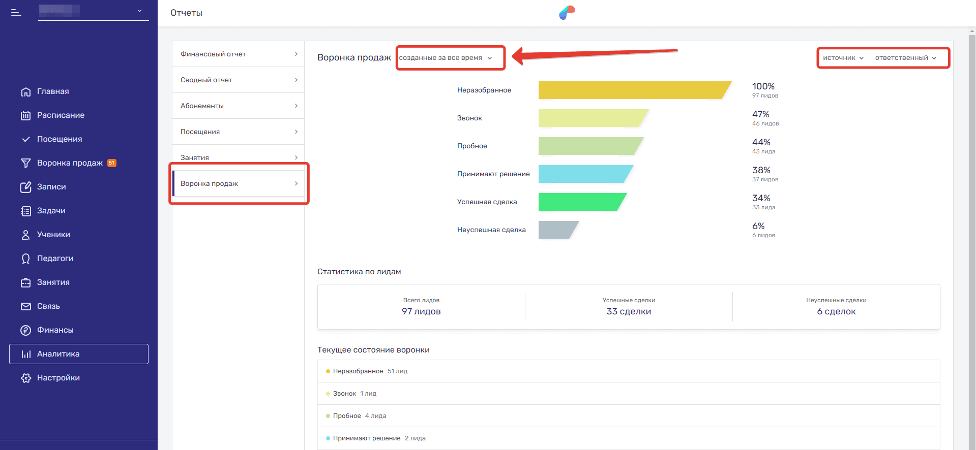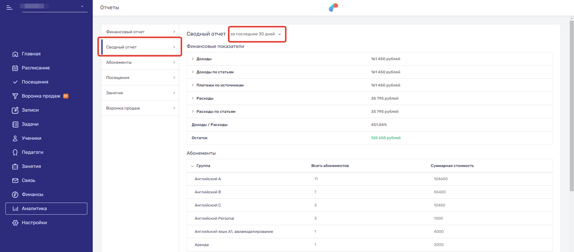 Раздел Аналитика аккумулирует данные по доходам, расходам, абонементам, посещениям и занятиям. Здесь же также можно посмотреть краткую сводку по Воронке продаж.
