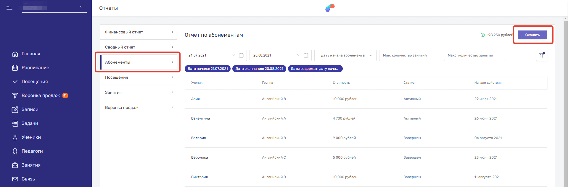 - Абонементы — в этой вкладке хранятся все оформленные абонементы. Вы можете фильтровать их по 15 критериям, чтобы сформировать конкретный список абонементов и увидеть сумму продаж (в верхнем правом углу у кнопки Скачать). Отчет можно скачать.