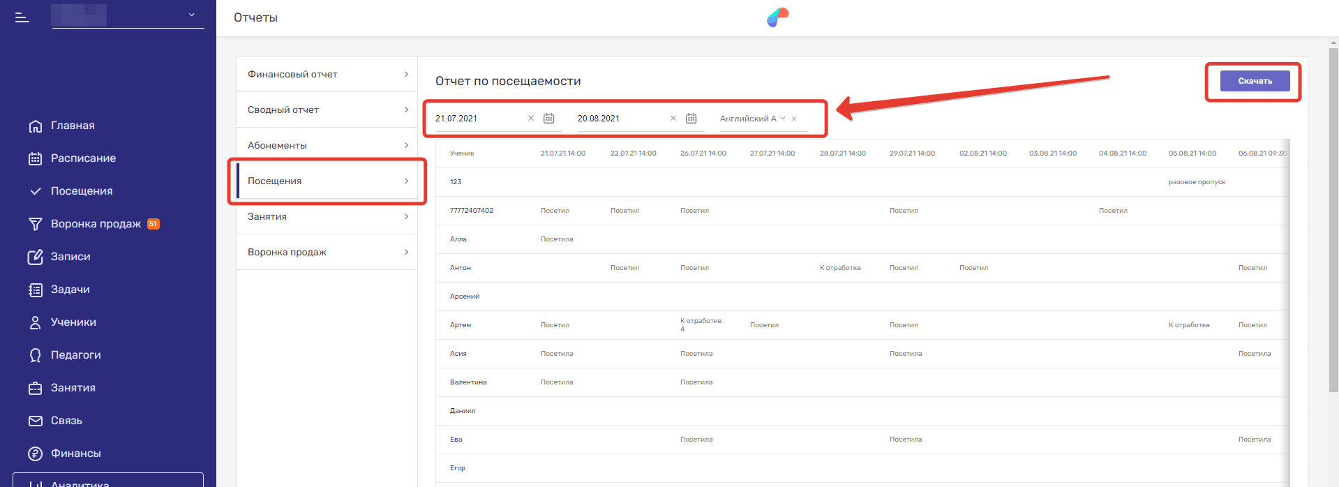 - Посещения — его можно назвать своеобразным журналом посещаемости, в котором отображаются ученики, даты занятий, присвоенные статусы посещений и оценки. Внизу таблицы ведется общая статистика по статусам: сколько каких статусов посещений было присвоено. Чтобы получить статистику, вы должны указать период и выбрать конкретное занятие. Отчет можно скачать.