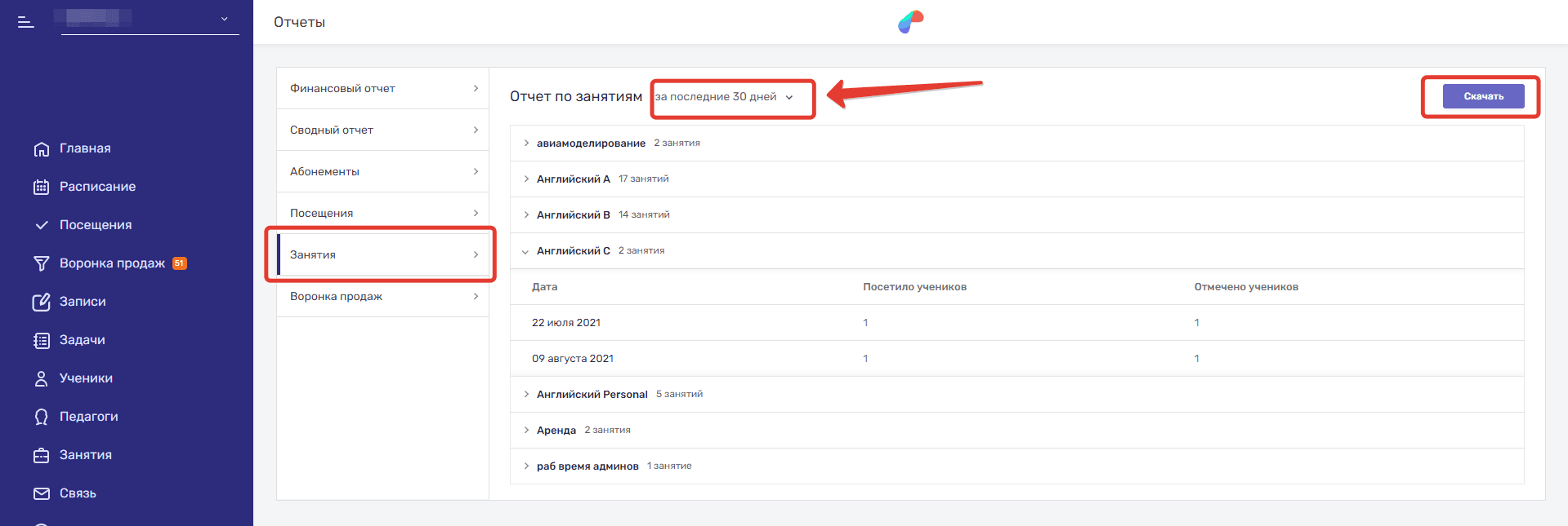 - Занятия — здесь вы можете посмотреть, сколько конкретно у каждого занятия было посещений и общее количество проставленных отметок. Отчет можно скачать.