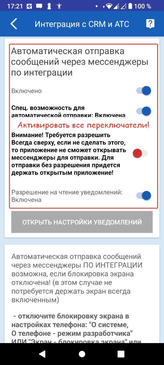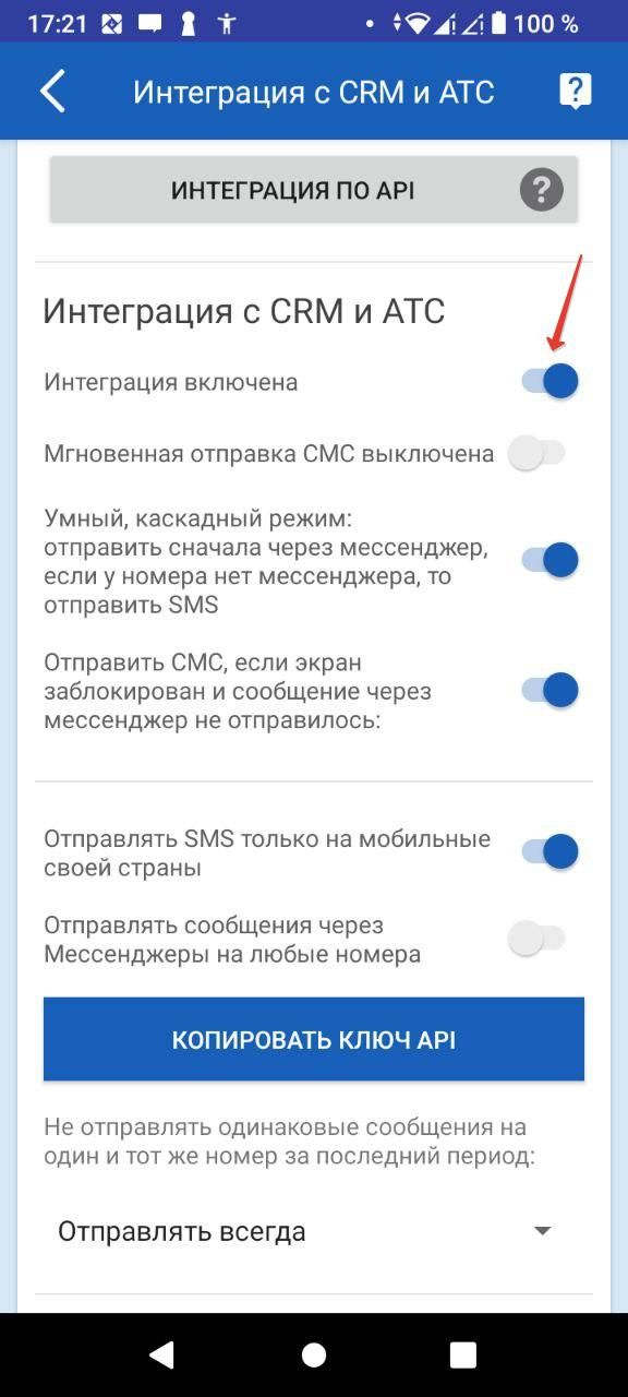- в приложении включить опцию Интеграция с CRM и АТС для получения ключа API