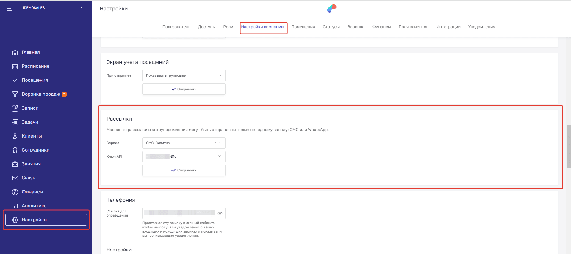 Чтобы осуществить массовую рассылку по ученикам и лидам и настроить автоуведомления по WhatsApp, требуется настройка интеграции с сервисом СМС-Визитка.