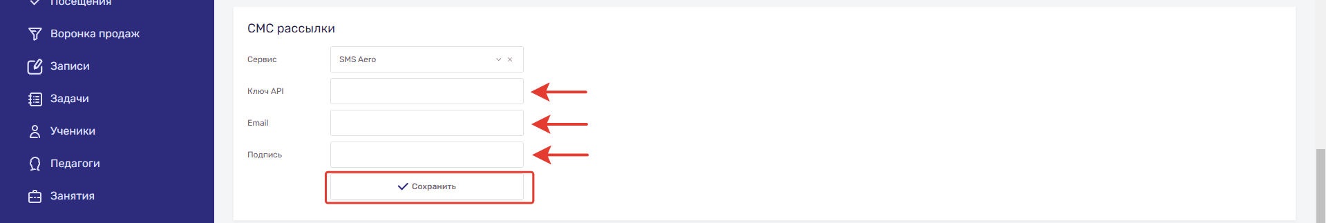 - В блоке СМС рассылки для SMS Aero внести Ключ API из настроек сервиса SMS Aero