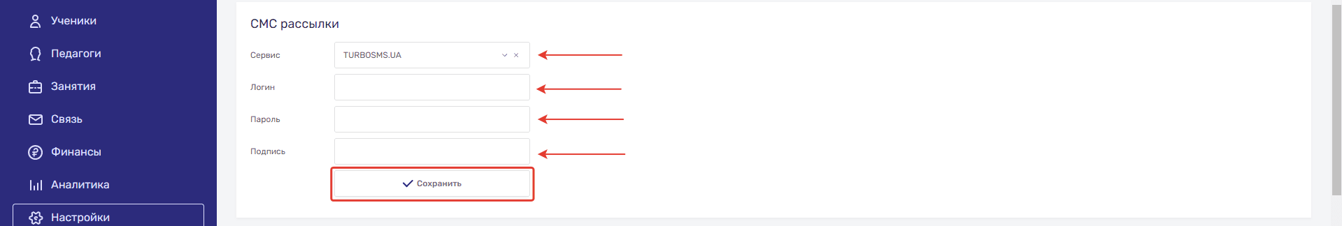 - В подразделе СМС рассылки для TURBOSMS.UA внести Логин из настроек сервиса, интеграция идет через метод soap