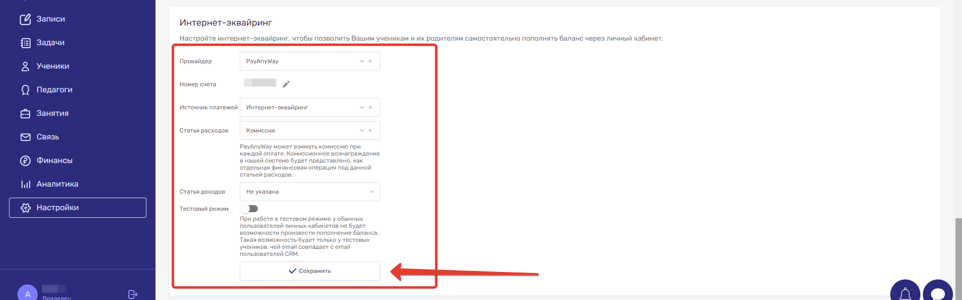 - Есть возможность включить Тестовый режим, чтобы изучить работу эквайринга