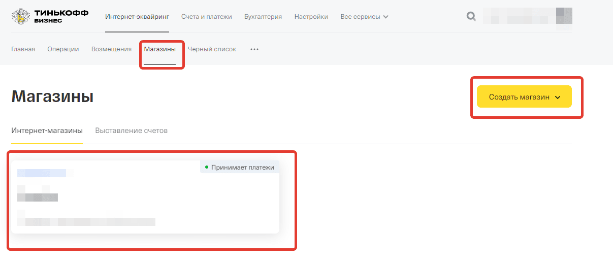 - Перейти в раздел Интернет-эквайринг во вкладку Магазины