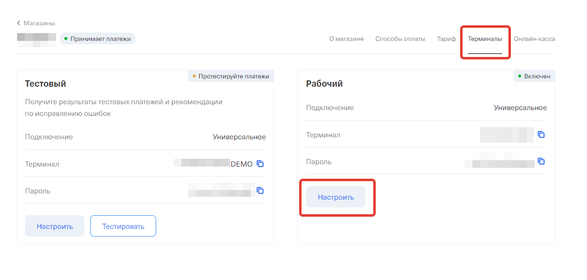 - Выбрать рабочий терминал, если он доступен. Если нет, то сначала тестовый, а после тестов перейти на рабочий