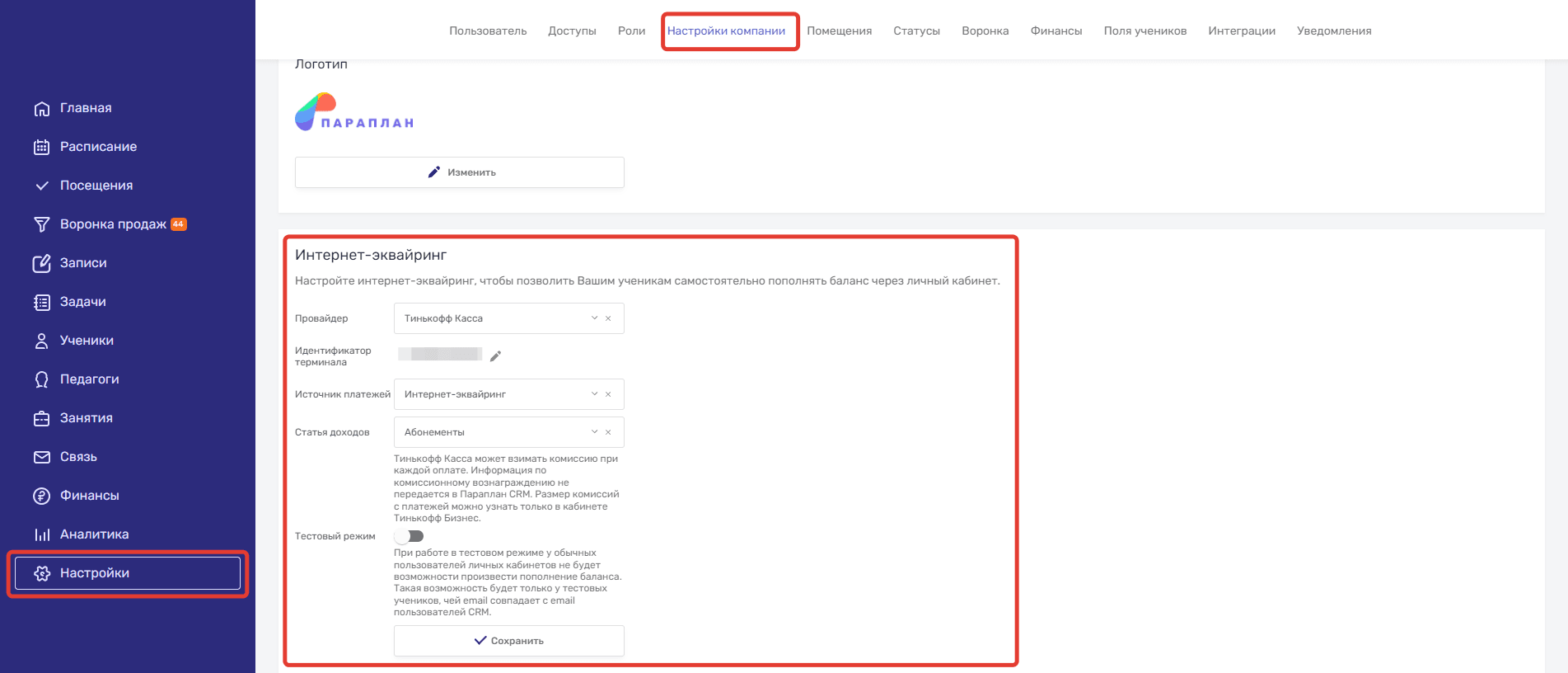 Чтобы настроить интеграцию интернет-эквайринга Тинькофф и Параплан CRM, у вас должен быть аккаунт в Тинькофф Бизнес. В кабинете Тинькофф Бизнес вы можете подключить интернет-эквайринг, пройдя регистрацию в соответствии с требованиями Тинькофф.