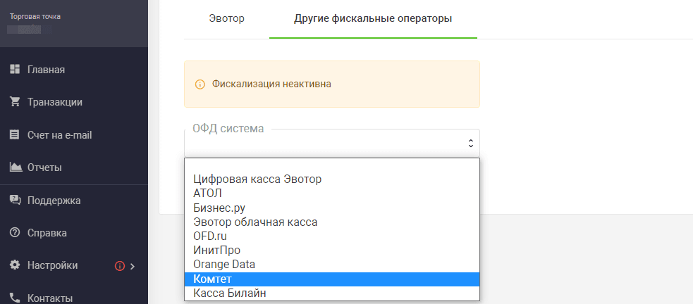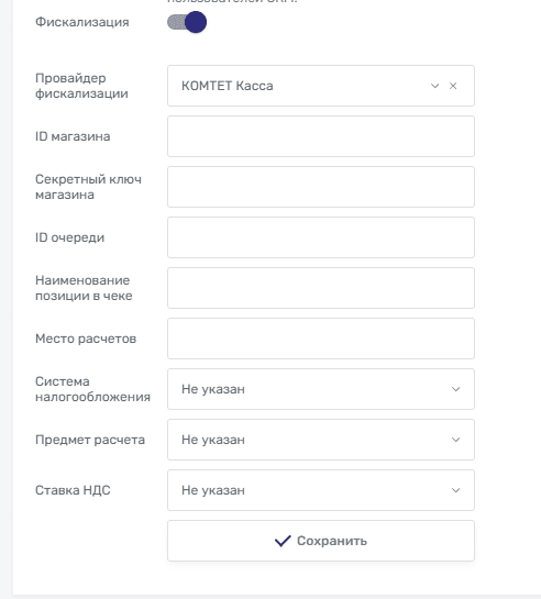 В кабинете интернет-эквайринга вам нужно подключить КОМТЕТ Кассу и заполнить все поля. Данные магазина можно найти в кабинете КОМТЕТ Кассы во вкладке Магазины.