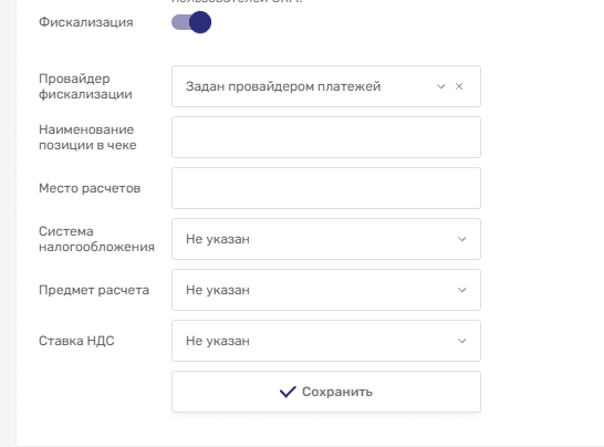 - В поле Провайдер фискализации выберите пункт Задан провайдером платежей