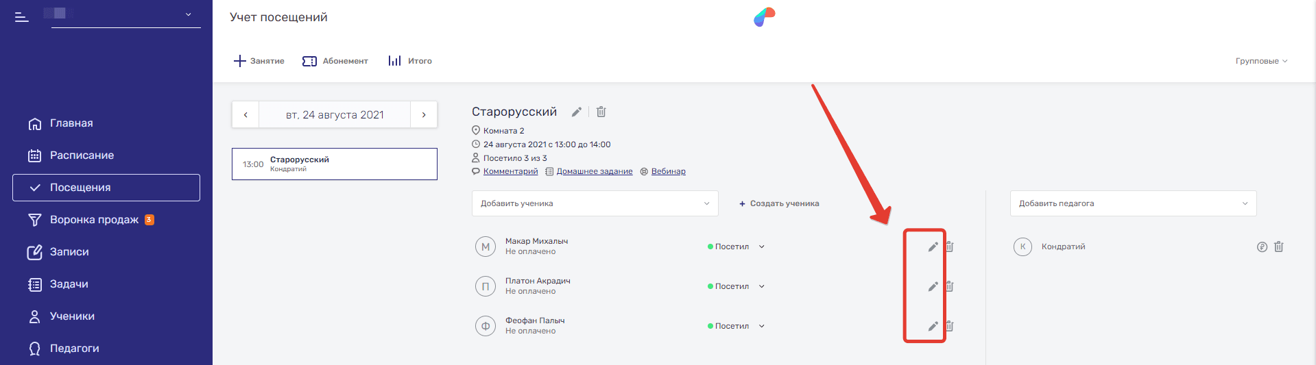 - Проставьте статус посещений ученику, которому хотите указать оценку