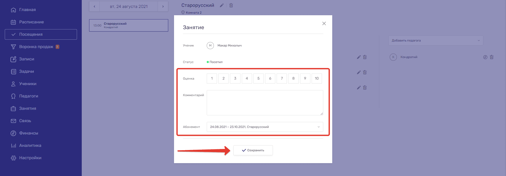 Оценка появится в профиле ученика во вкладке Посещения, в Аналитике и в Личном кабинете ученика.
