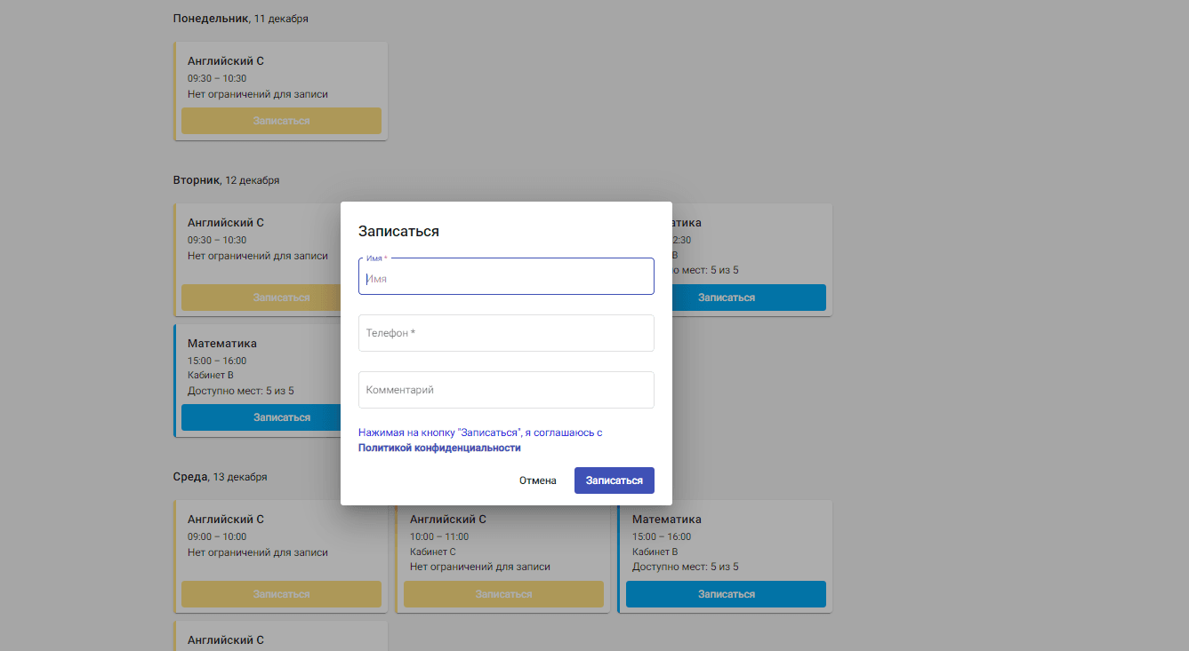 У каждого занятия есть кнопка Записаться. При клике на кнопку появляется форма сбора контактов. Клиент должен заполнить: