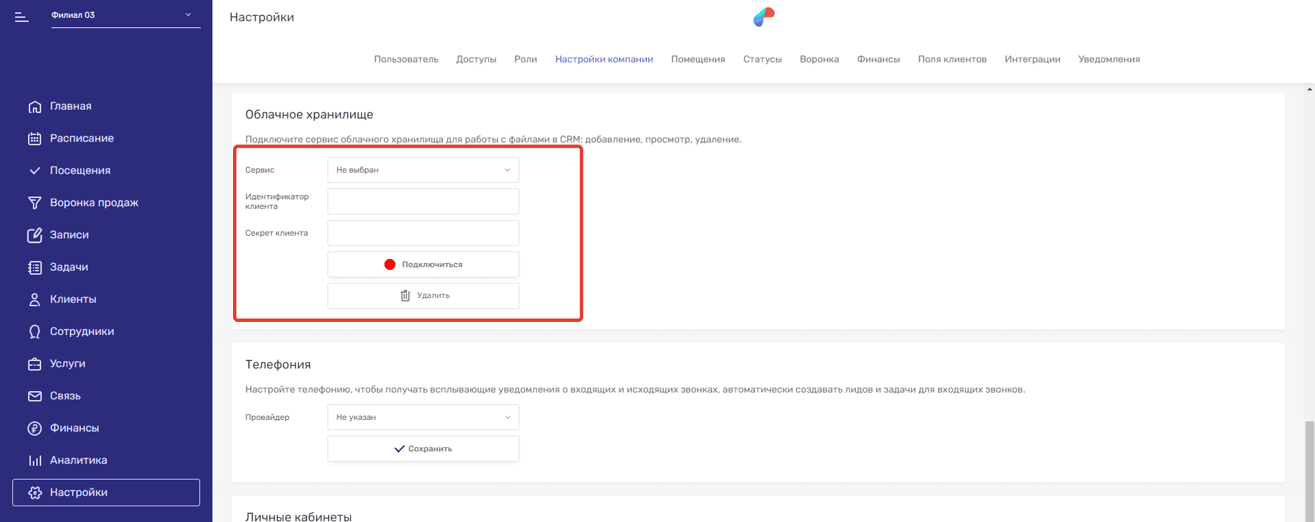 - Перейти в Настройки → Настройки компании → Облачное хранилище