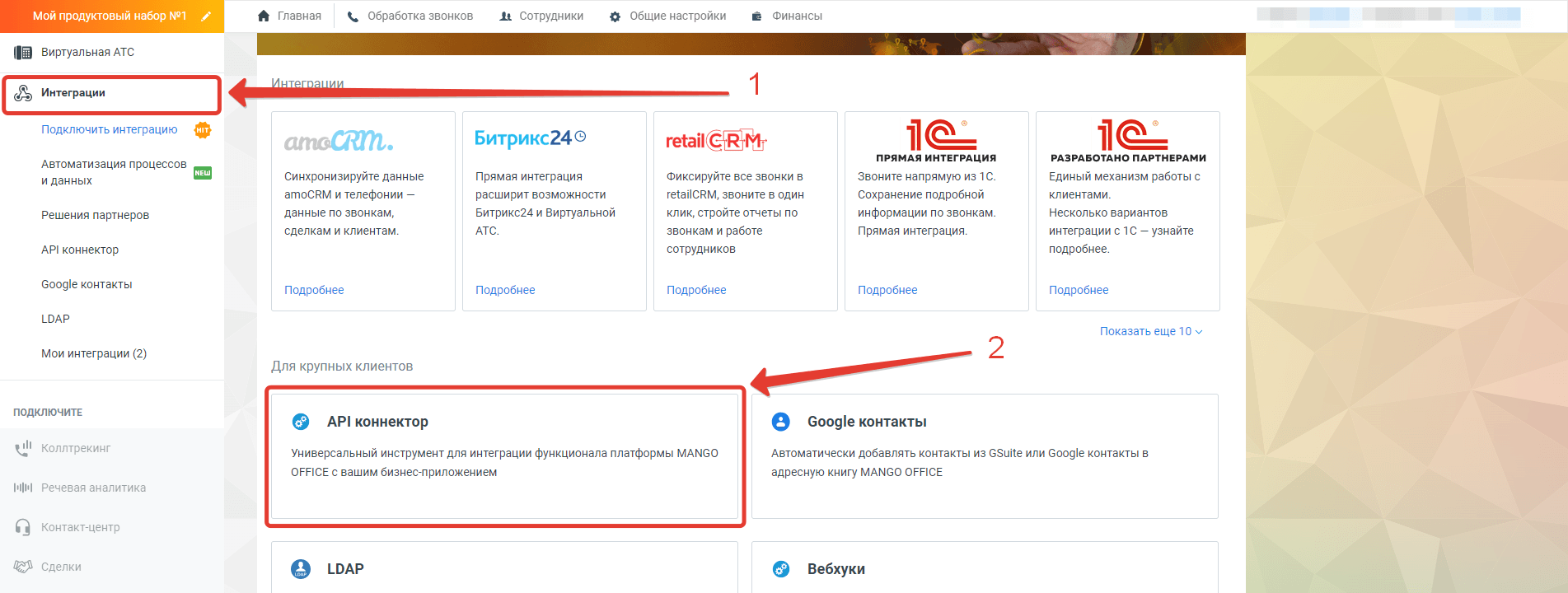 - Перейдите во вкладку Интеграции, затем во вкладку API коннектор